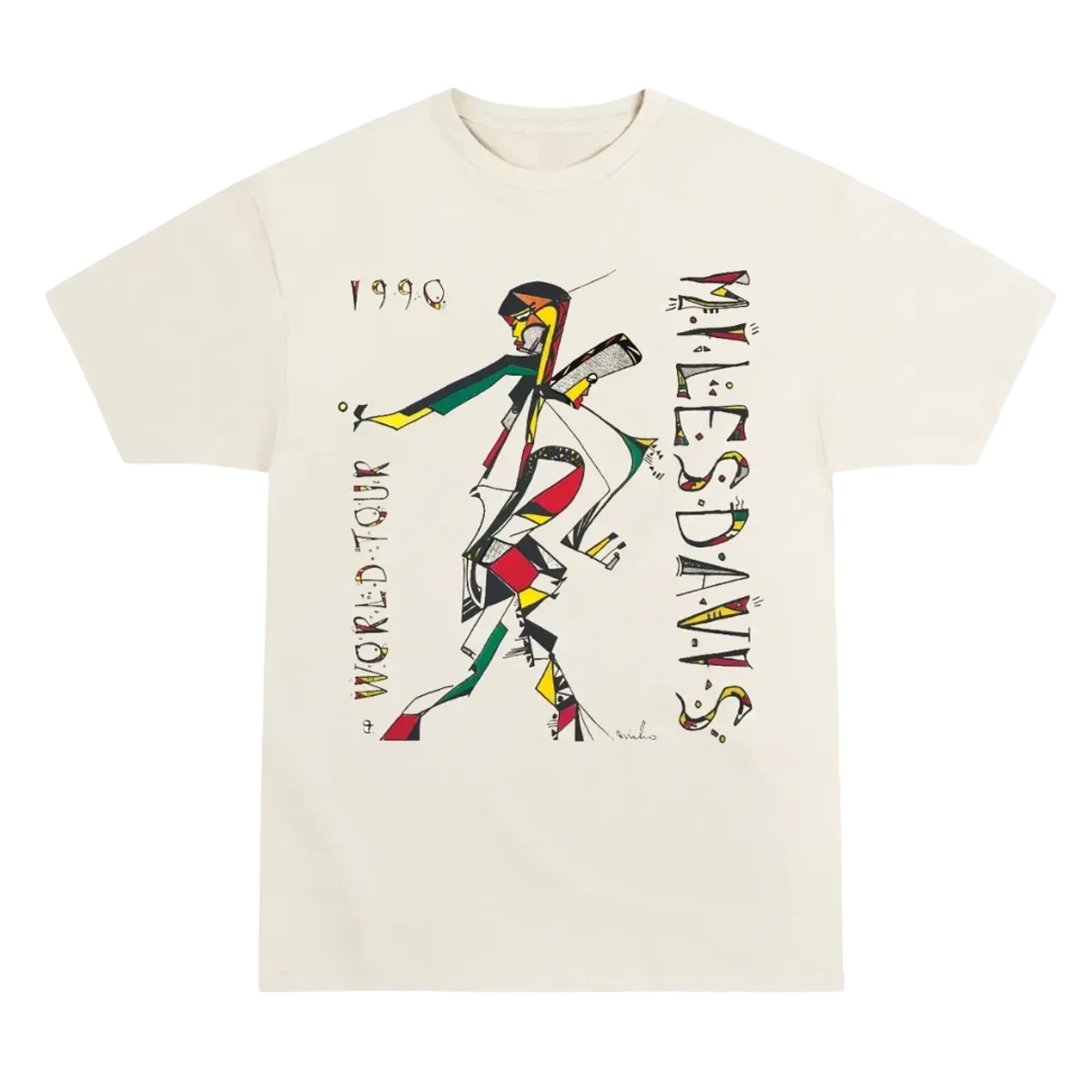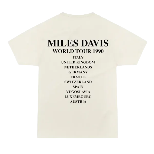 Double Sided Miles Davis World Tour 1990 T-Shirt. Step back in time with this vintage inspired Miles Davis 1990 World Tour T-Shirt and pay tribute to one of jazz's most iconic legends. The front of the shirt features original artwork created by Miles Davis himself, and on the back you will find a list of the many tour destinations. Printed on Earth Positive -100% Combed Organic Cotton – Jersey 4.57 oz / 155 g GOTS, Fair wear & Carbon Neutral Accredited.